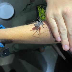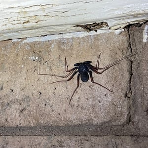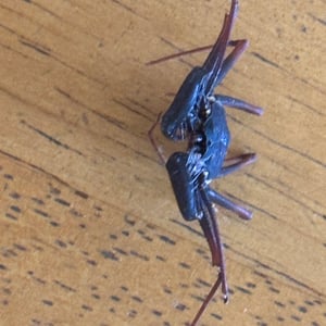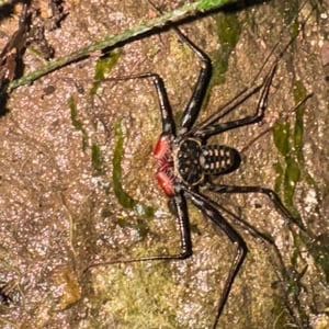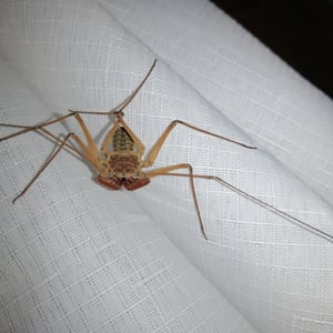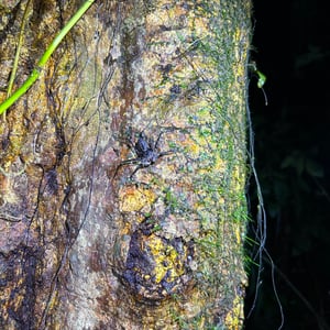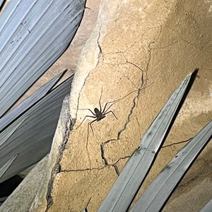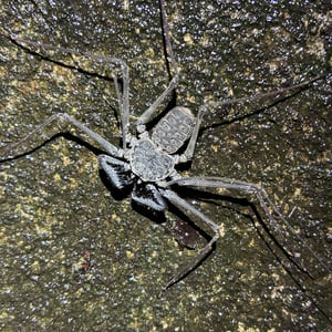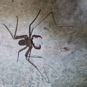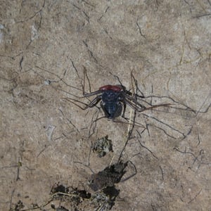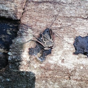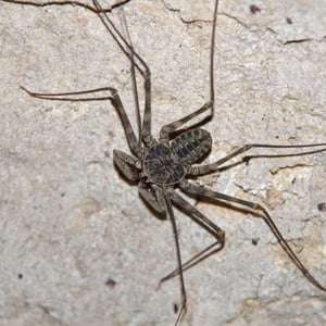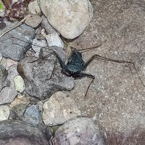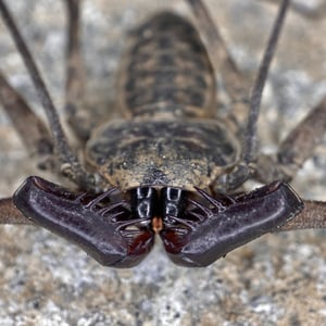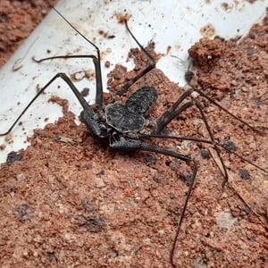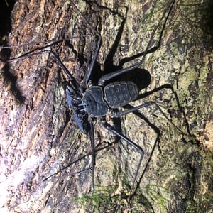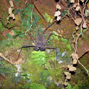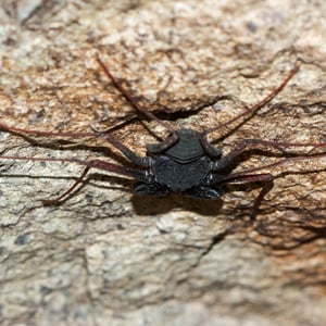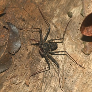 Like other Amblypygi, the species in this genus are nocturnal predators that dwell in moist microenviornments. Some species are troglophiles and some are true troglobites. They feed upon insects and other arachnids. Paraphrynus have flattened bodies that are approximately 3/8” (3-11 mm) long, with spiny pedipalps and antennae-like legs referred to as antenniform legs. The front, first pair of legs are long filamentous or whip-like tips, while the other 3 pairs of legs are positioned to the side, crablike. The longer front legs are sensory organs that are used to "feel" about and locate its prey, which they then ensnare with the spiny pedipalps. Research conducted by biologists also found that the front legs of P. laevifronsis are used to navigate to their refuge prior to dawn, usually spending the night hunting for prey on the vertical surfaces of tree trunks in a neotropical environment.