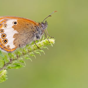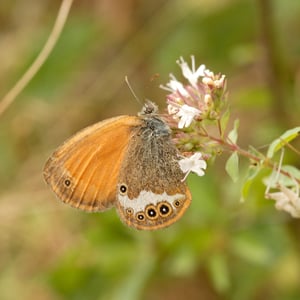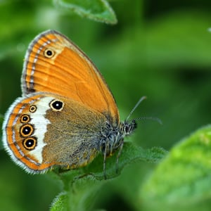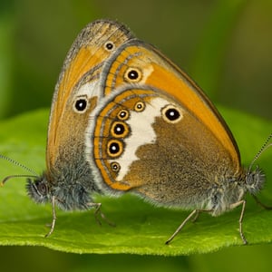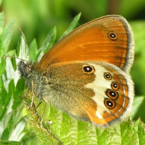 Coenonympha arcania, the pearly heath, is a butterfly species belonging to the family Nymphalidae. It can be found in Central Europe. It resembles Coenonympha hero. Seitz describes it thus C. arcania L. (48 d). Forewing fiery reddish yellow with black distal margin, hindwing dark brown. Easily recognised by the underside of the hindwing, whose marginal portion is occupied by a broad white band, which in the nymotypical form interrupts the row of ocelli below the apical eye, the latter therefore appearing to be placed on the inside of the white band. All Europe except great Britain, from Scandinavia to the Mediterranean sea and from Spain and France to the Black sea and Armenia. — Specimens with a very broadly black margin to the forewing and a narrowed and slightly dentate band on the underside of the hindwing, which probably occur among nymotypical specimens everywhere, but especially in the South, are considered as ab. insubrica Frey (48 d). — Larva green with dark dorsal stripe bordered with a yellowish tint, light subdorsal stripe and pale yellow lateral stripe; head blue-green, mouth and anal fork red. Until May on grasses. Pupa brown, with whitish wing-cases edged with red. Butterflies very common in June and July and often flying together in large numbers. At the edge of woods full of undergrowth, but also in the open country and on hills. They affect flying round bushes and settle on the tip of low twigs, but sometimes also fly up into the higher branches of trees. The females are much less numerous than the males and appear later. The butterflies fly in one generation from May to August. The larvae feed on various grasses.