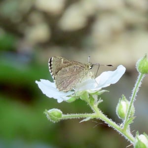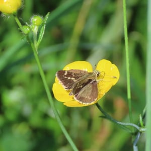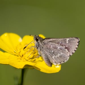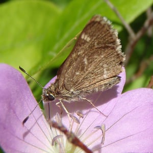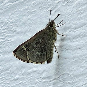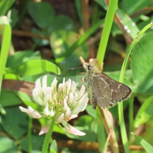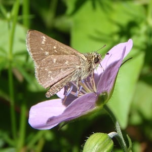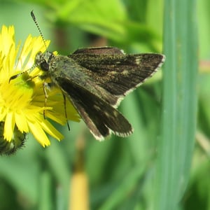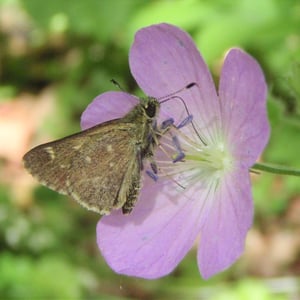 Amblyscirtes hegon, the pepper-and-salt skipper, is a butterfly of the family Hesperiidae. It is found from Nova Scotia and Maine, west to southern Manitoba, south to Georgia, northern Florida and south-eastern Texas. It is mostly absent from the coastal plain. The wingspan is 25–31 mm. Adults are on wing from April to July. There is one generation per year. The larvae feed on Poa pratensis, Sorghastrum nutans, Sorghastrum secundum, and Chasmanthium latifolia. Adults feed on flower nectar, including viburnum and blackberry.