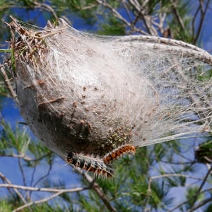 T. pityocampa is highly social. Throughout its life cycle, an individual makes several shelters, possibly for protection from predators; the larvae emerge to feed at night. The first of these is flimsy and temporary, but in the third instar, they build a permanent nest. Once the permanent nest is built, the caterpillars become foragers, staying in the vicinity of the nest. The nest has no openings, so caterpillars force themselves through the layers of the shelter. The waste from the larvae's diet falls as frass and accumulates at the bottom of the nest.