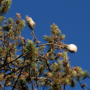 Though most individuals of the species only live one year, some in high altitudes or more northern areas may survive for over two years. Each female lays an "enormous number" of eggs near the tops of pine trees. After hatching, the larvae eat pine needles while progressing through five stages of development (instars). To survive through the winter, the caterpillars construct a nest of silk threads, making them one of the few species of temperate zone insects where the larvae develop in winter. Around the beginning of April, the caterpillars leave the nests in the procession for which the species is known. They burrow underground, pupate, and emerge between mid May and August. The eggs are laid in cylindrical bodies ranging from 4 to 5 cm in length. The eggs are covered with scales which come from the female and mimic pine shoots. The larva is a major forest pest, living communally in large "tents", usually in pine trees but occasionally in cedar or larch, marching out at night in single file (hence the common name) to feed on the needles. There are often several such tents in a single tree. When they are ready to pupate, the larvae march in their usual fashion to the ground, where they disperse to pupate singly on or just below the surface. The moth's pupal stage occurs in a white silken cocoon under soil. The pupae measure around 20 mm and are a pale brownish-yellow that changes into a dark reddish brown. As an adult, T. pityocampa has predominantly light brown forewings with brown markings. The moth's hindwings are white. Females have larger wingspans of 36 to 49 mm, compared to a male's 31 to 39 mm. Adults only live for a single day, when they mate and lay eggs. How far they are able to spread depends on how far the female is able to fly during her short time as an adult. Her average flying distance is 1.7 km, with a maximum recorded of 10.5 km.