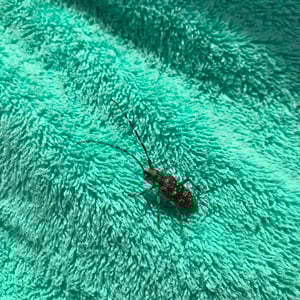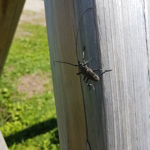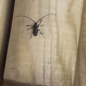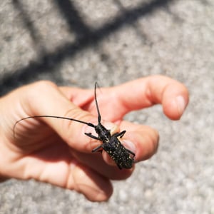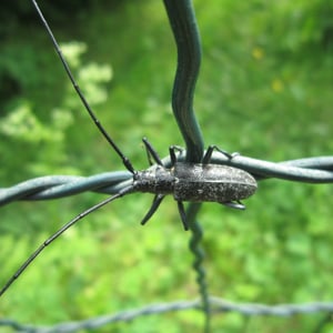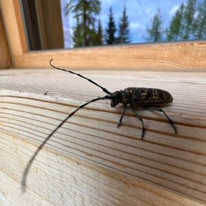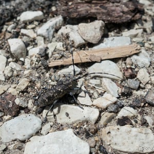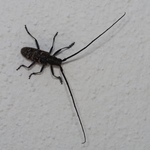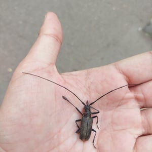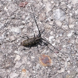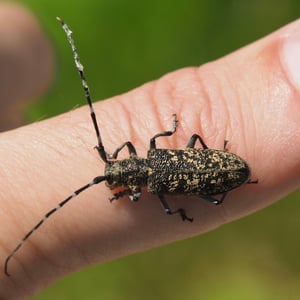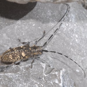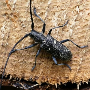 Monochamus sutor, commonly known as the European sawyer beetle, is a species of longhorn beetle found in Europe. It is characterized by its elongated body, measuring around 15-25 millimeters in length, and its distinctive long antennae. The adults are black or dark brown in color with yellowish markings, while the larvae bore into the wood of various coniferous trees. This insect is considered a pest in forestry, as it can cause damage to timber by tunneling through the wood.