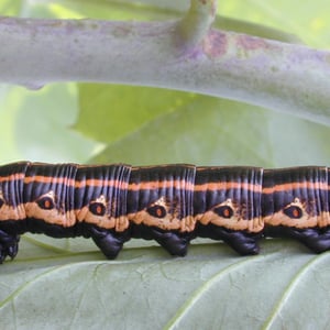 It is nocturnal. It feeds on the nectar from deep-throated flowers including moonflower (Calonyction aculeatum), morning glories (Convolvulus species), and petunias (Petunia species). The larva is a large, stout caterpillar with a horn. It feeds during the day and the night on sweet potato (Ipomoea batatas), Datura species, and other plants. It is known as a pest of sweet potato.