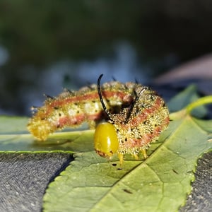 Females release a pheromone which attracts males that swarm around her like bees. Mating occurs during the morning. It is a rapid process. The male and female stay together for the rest of the day and then the female finds a place to lay eggs, usually under oak leaves. Such mating swarms have been observed at carrion, where host plants may be higher quality due to the influx of nutrients associated with decomposition. The caterpillars are gray or greenish with dull brownish yellow or rosy stripes. There are scales on each segment and two long spines on the mesothorax. The caterpillars pupate for a short time. They feed on the foliage of oak trees, maples, birches, and hazels. The caterpillar overwinters in the soil as a pupa. Caterpillars that are newly hatched or are in the middle of growing feed in groups while those that are mature or nearly so feed separately. The caterpillar is about an eighth of an inch long. The head is large in proportion to the body. The inside of the mouth is yellow. The legs are semi-translucent.