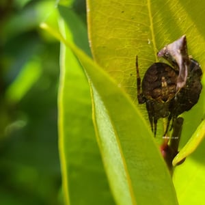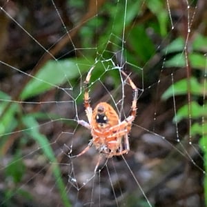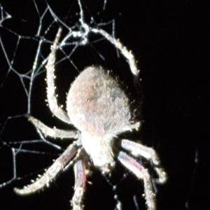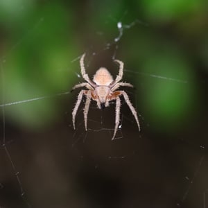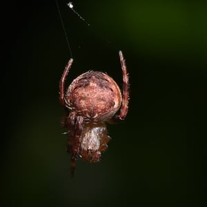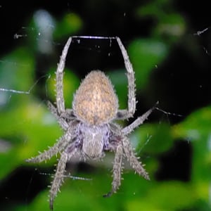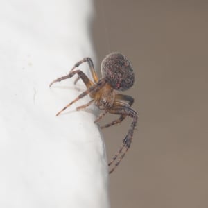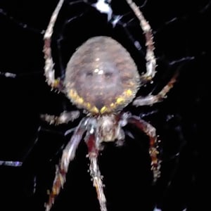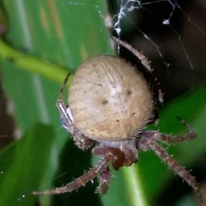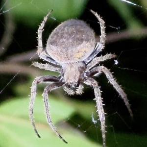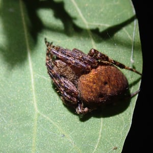 Neoscona punctigera is a widespread species of orb-weaver spider found from Japan to mainland Asia, Australia and several Western Indian Ocean islands. The female reaches about 1.1 cm and the male about 0.7 cm. It is well-camouflaged during the day when sitting on bark, but when it hunts during the night it sits in the web and attracts insect prey with its bright, contrasting spots on the underside of the abdomen. N. punctigera builds spiral shaped webs. This spider and close relatives (for example, N. vigilans) are commonly found in the Philippines, where the females frequently are used for spider fighting.