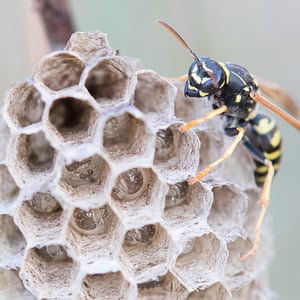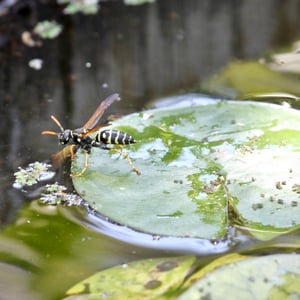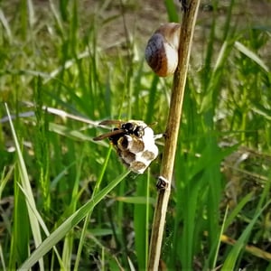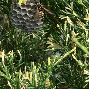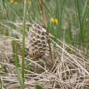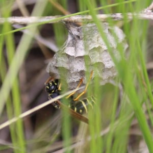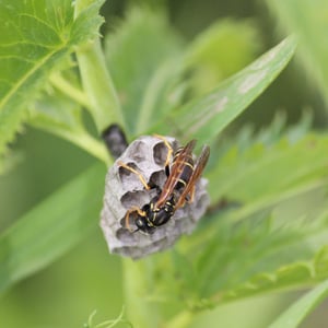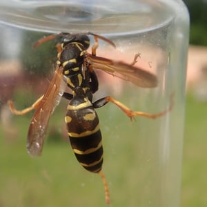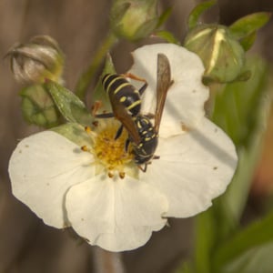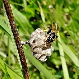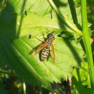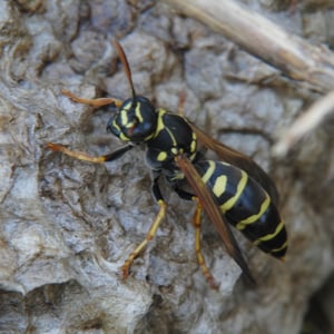 Polistes nimpha is a species of paper wasp commonly found in North America. They are medium-sized insects, measuring around 1-2 centimeters in length. These wasps have a slender body with a black and yellow coloration pattern. They are known for building distinctive paper nests, usually attached to tree branches or man-made structures.