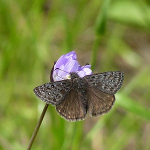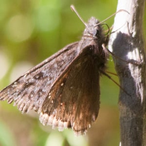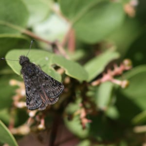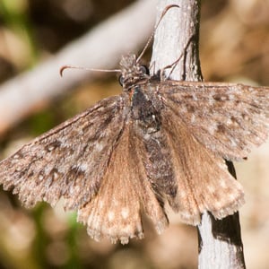 Erynnis propertius, the Propertius duskywing, is a butterfly of the family Hesperiidae. It is found in along the west coast of North America from southern British Columbia south along the Pacific Slope to Baja California Norte. It is one of the most commonly seen skippers in California. The wingspan is 35-45 mm. Its wings are mottled brown, the fore wings with white spotting. While other duskywings like the funereal duskywing and the mournful duskywing have white fringe on their hind wings, the Propertius duskywing has brown fringe. The larvae have a light green body and brown head. They feed on Quercus species. Adults feed on a wide variety of flower nectar.