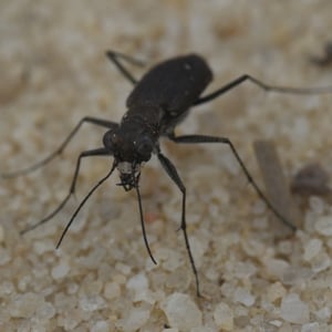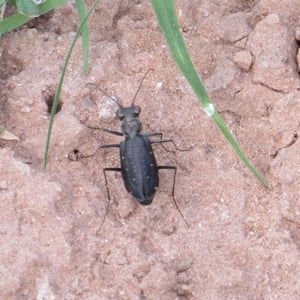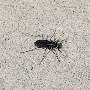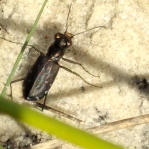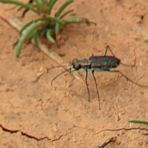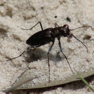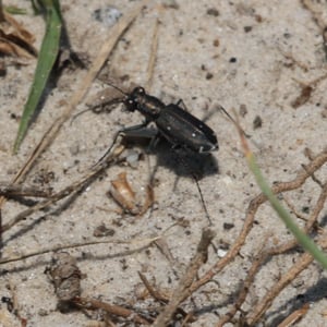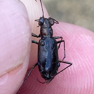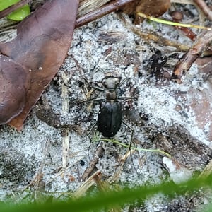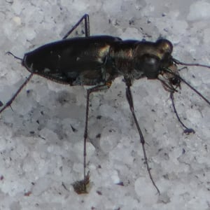 Cicindela punctulata, commonly known as the green tiger beetle, is a species of ground beetle found in North America. It is characterized by its vibrant metallic green coloration and distinctive white spots on its elytra. This predatory insect is known for its exceptional speed and agility, often seen darting across sandy or gravelly habitats in search of prey. Its diet primarily consists of small insects, making it an important natural control agent in maintaining ecological balance.