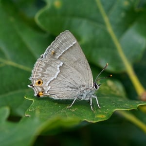 This active little butterfly is most often seen fluttering around high up in oak trees on warm sunny July and early August days. Males have a glossy purple sheen on the upperside, females have two patches on the forewing only. The underside is light grey with a white streak, edged in black, running down the middle of both wings. The hindwings have a short tail with two orange spots at the base on the underside. It is common and widespread across southern and central England and Wales, becoming rarer and more isolated in the north as far as central Scotland. In Ireland it occurs in a few isolated colonies scattered across the country but is probably still under recorded due to its reclusive habits. Males tend to stay high up in trees, females come down to lower levels to lay eggs. Both sexes feed mainly on honeydew although females are occasionally attracted to flowers whilst taking a break from egg laying.