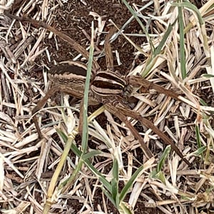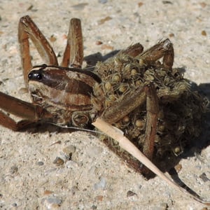 The species likes cotton fields and wooded areas. They usually live in holes and garbage of various kinds. Sometimes they might be found around ponds or in deep burrows that are covered by debris. This species doesn't build webs to catch prey, instead they weave the silk to wrap their prey in, or to protect their young. They hunt at night, by ambushing their prey, or chasing it. Sometimes, in order to catch their prey, they camouflage themselves as bark or leaves. During breeding, the male performs a "dance" in front of the female, and makes a noise with its legs. If mating is successful, the female will begin to lay its eggs and build an eggsack out of silk, which she will use to carry her young in. When the spiderlings are born, they ride on the mother's back until they are old enough to be on their own. Rabid wolf spiders may bite if provoked, but their bite is not dangerous to humans.
