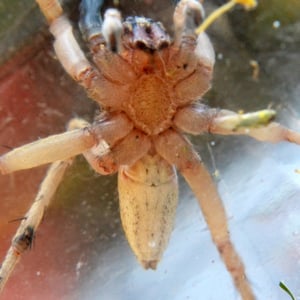 The cephalothorax has two dark stripes. The abdomen has one stripe of the same color. Other parts of the spider are yellow. The females are larger than males, and have a body length of about an inch, while the males' body length comes as a half of that. The species has eight eyes: four above, and four below, which look more like a spider's moustache. B. J. Kaston distinguishes R. rabida from R. punctulata by observing that the males of the former have front legs that are mostly black, whereas the latter have all legs of the same color.