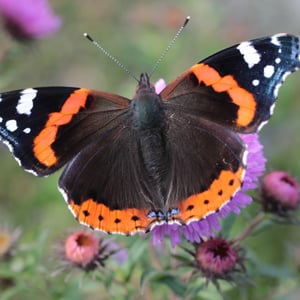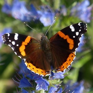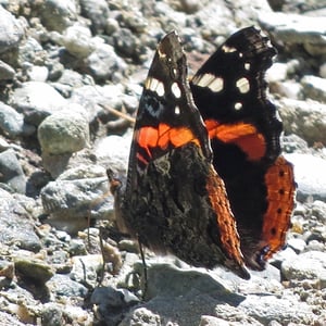 Vanessa atalanta, the red admiral or, previously, the red admirable, is a well-characterized, medium-sized butterfly with black wings, red bands, and white spots. It has a wingspan of about 2 in. It was first described by Carl Linnaeus in his 1758 10th edition of Systema Naturae. The red admiral is widely distributed across temperate regions of North Africa, the Americas, Europe, Asia, and the Caribbean. It resides in warmer areas, but migrates north in spring and sometimes again in autumn. Typically found in moist woodlands, the red admiral caterpillar's primary host plant is the stinging nettle (Urtica dioica); it can also be found on the false nettle (Boehmeria cylindrica). The adult butterfly drinks from flowering plants like Buddleia and overripe fruit. Red admirals are territorial; females will only mate with males that hold territory. Males with superior flight abilities are more likely to successfully court females. It is known as an unusually calm butterfly, often allowing observation at a very close distance before flying away, also landing on and using humans as perches.