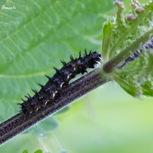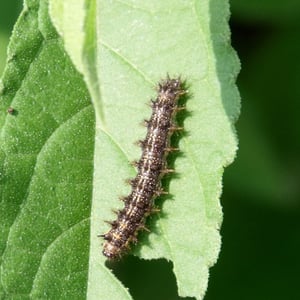 Red admiral larvae measure approximately 1 in in length. Their coloration is variable, but they are usually black with white spots and spines. These spines persist into the pupal phase. In laboratory tests where larvae were reared at various constant temperatures, a difference in pupal period and coloration was found. At higher temperatures, around 32 degrees Celsius (90 °F), the pupal period of the red admiral is 6 days. At 11 to 18 degrees Celsius (51 to 64 °F) this period increases to 18 to 50 days. At even lower temperatures around 7 degrees Celsius (45 °F), the pupal period lasts between 47 and 82 days. The pupae are bright scarlet at high temperatures and black with a smaller scarlet area at low temperatures. This differential coloration at various temperatures may explain why the summer form of the red admiral is brighter and more heavily pigmented than the winter form. The primary host plant for the red admiral is the stinging nettle (Urtica dioica), but it can also be found on the false nettle (Boehmeria cylindrica), Pennsylvania pellitory (Parietaria) and other species within Urticaceae. Certain plants of the families Compositae and Cannabaceae may also be used as hosts.