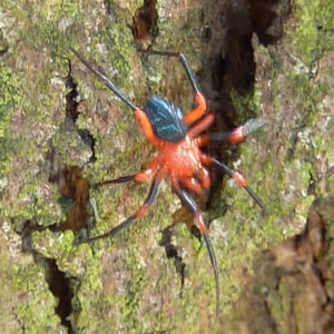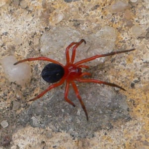 Nicodamidae is a family of araneomorph spiders with about thirty species in seven genera. They are small to medium-sized spiders found near the ground of eucalypt forest in small sheet webs. The species of this family are only present in Australia and Papua New Guinea. In most cases the cephalothorax and legs are uniformly red and the abdomen black, for which these species are sometimes called the "red and black spiders".
