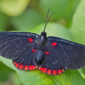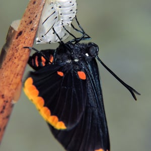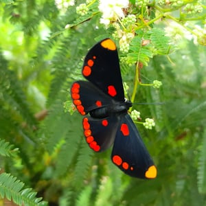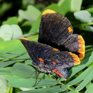 Melanis pixe has a wingspan of about 40 mm. The upperside of the wings is black. The tip of forewing is yellow orange and the base has a red spot. The hindwing outer margin has a band of red spots. Eggs are laid in groups of 10 to 30 on the host tree leaves, stems, or bark and the caterpillars feed on the leaves.