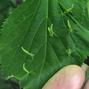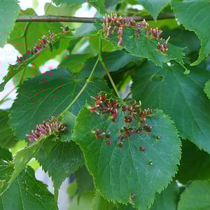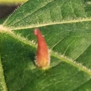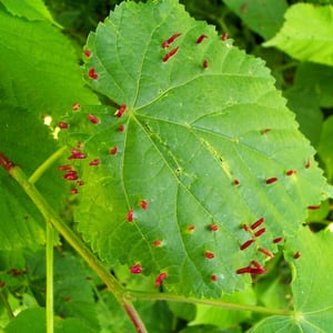 During late spring and summer, tubular growths up to 5 mm long develop apically on the leaves of Tilia sp. These galls are yellow-green or red in color, may be very numerous, and predominantly occur on the lower leaves in some sub-species. The galls appear not to affect the health of their hosts, and no way of controlling or preventing them exists.