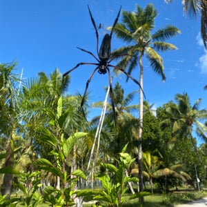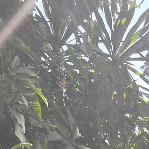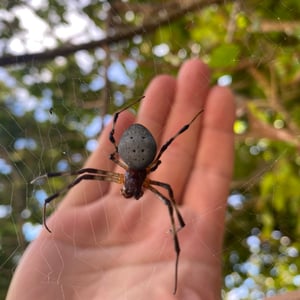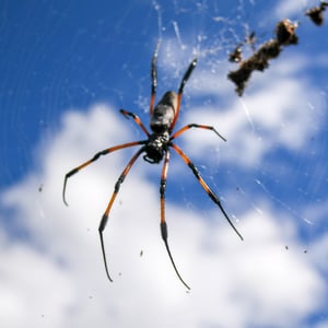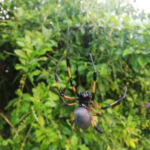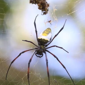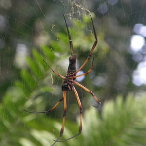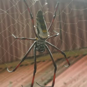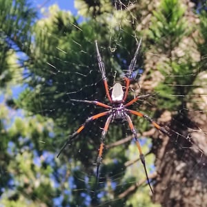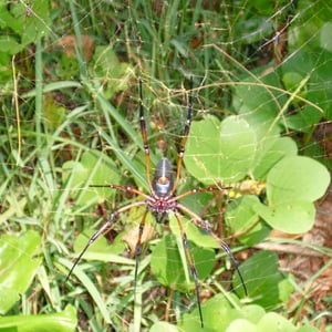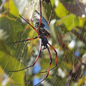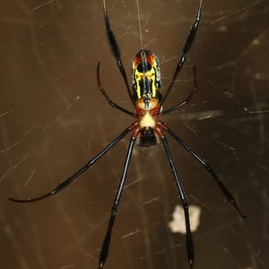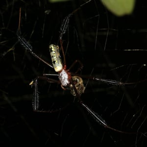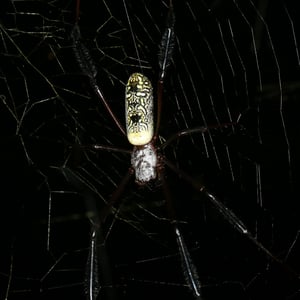 Trichonephila inaurata, commonly known as the golden orb-weaver spider, is a large and striking species of spider found in tropical and subtropical regions. The females are known for their vibrant golden coloration, which gives them their name. They construct intricate orb-shaped webs, which can reach impressive sizes of up to one meter in diameter. These spiders are known for their strong silk, which is not only used for web construction but also for capturing and immobilizing their prey.