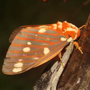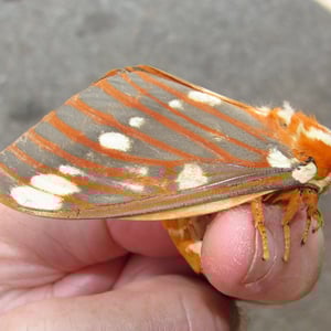 Citheronia regalis, the regal moth or royal walnut moth, is a North American moth in the family Saturniidae. The caterpillars are called hickory horned devils. The adult (imago) has a wingspan of 3.75-6.1 in (9.5-15.5 cm). The species was first described by Johan Christian Fabricius in 1793.