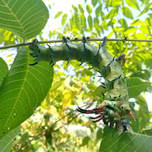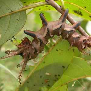 The adult moth is the largest moth by mass in latitudes north of Mexico, as are the spectacular larva and the substantial pupa. The life cycle of the moth is typical of the Saturniidae species, and typical of the Ceratocampinae. It burrows into the ground to pupate in an earthen chamber, rather than spinning a cocoon. Its eggs are yellowish, oval and 2 mm in diameter. They are laid either singly or in groups of up to four on the upper surface of the host plant leaves, favoring nut trees such as Juglans and Carya (walnuts and hickories). There are regional preferences, with the utilization of sweet gum and persimmon in the south, and sumacs where the others are not available. Larvae are solitary in later stages and rarely occur in numbers large enough to cause defoliation; however, an individual larva can strip several branches of their leaves during the ravenous fifth instar. The list of recorded hosts includes Carya (including Carya illinoensis), Juglans cinerea, Liquidambar styraciflua, Diospyros virginiana, Rhus, Gossypium, and others. Adults do not feed. When the eggs hatch 7 to 10 days later, small yellow larvae that darken rapidly emerge. The caterpillars are solitary nighttime feeders in early stages, when they curl up in a "j" shaped pattern during the day and resemble two-toned bird droppings. As the caterpillars age, they feed during the day. They molt four times. Each instar is different, but on their fifth and final instar they become a bright green color, with huge, black-tipped red horns, earning them their common name hickory horned devils. They feed heavily on their host plant for 37 to 42 days and can grow up to 15 cm long. Their frightening appearance is purely a ruse; the spines, though prickly, do not sting, and the larva is harmless and actually one of the more easily handled of the saturniidae. Just before pupation, the larva expels its gut and changes color from green to turquoise, the skin of the fully fed creature stretched shiny and tight. They then crawl down the host plant, where they burrow into the dirt and pupate in a well formed chamber at a depth of five to six inches. The pupae are dark brown/black in color, and have a relatively short cremaster. Some pupae overwinter for two seasons, perhaps as an adaptation to variable and adverse conditions such as fires and flooding, or to maintain genetic diversity across generations. When the moths eclose (emerge), they have to pump their wings with fluid (hemolymph) to extend them. The females emit pheromones, which the male can detect through its large, plumose antennae. Males can fly for miles in order to reach a female. After the moths mate, the female spends the majority of the remainder of her life laying eggs, while the male may mate several more times. Adults of this family of moths have vestigial mouths, meaning their mouthparts have been reduced. Because of this, they do not eat and only live for about a week as adults. There is a single generation of Citheronia regalis throughout its range, but in the deep south, moths have been recorded throughout the longer growing season. Typically, Citheronia regalis is a midsummer moth, on wing from late June through August with larvae peaking August through October. There is a distinct bell curve to the emergence, with peak weeks coinciding with the first spell of the humid summer weather which may synchronize emergences.