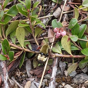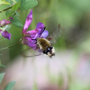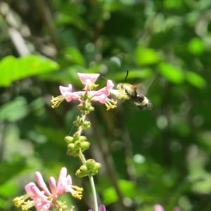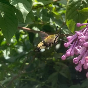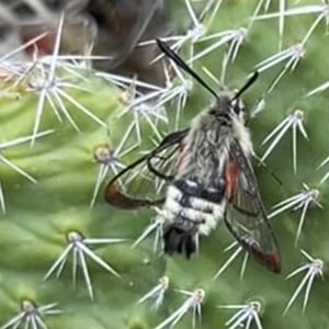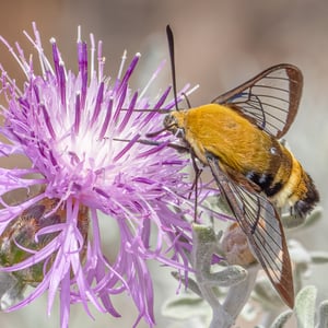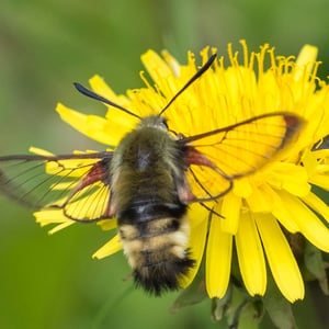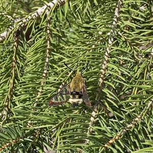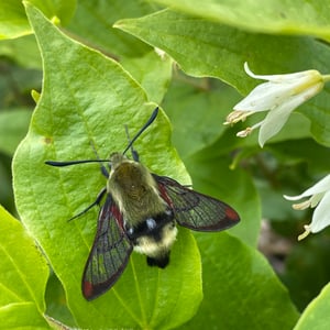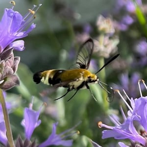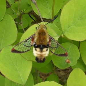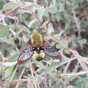 Hemaris thetis, the Rocky Mountain clearwing or California clearwing, is a moth of the family Sphingidae. The species was first described by Jean Baptiste Boisduval in 1855. It is found from Colorado, New Mexico, Montana, Idaho, Wyoming and Utah west to California and north to British Columbia. The habitat consists of streamsides and meadows in mountainous areas. The wingspan is 35–50 mm. It is a diurnal species. The head and thorax are brownish olive or olive green. The abdomen is black or olive green above and yellow below, there is a broad yellow band. The wings have a narrow brown border and the clear parts of the wings have a steel-blue glow. The scaled areas of wings range from dark brown to light brownish orange. Each wing has a large transparent patch which covers most of the wing surface. There is probably one generation per year with adults on wing from May to August. They feed on the nectar of various flowers, including Arctostaphylos uva-ursi and Lupinus species. The larvae feed on Symphoricarpos species.