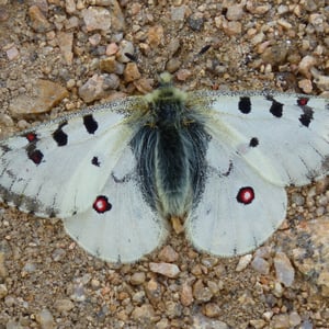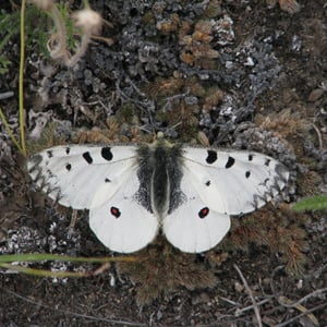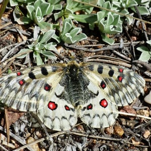 Parnassius smintheus, the Rocky Mountain parnassian or Rocky Mountain apollo, is a high-altitude butterfly found in the Rocky Mountains throughout the United States and Canada. It is a member of the snow Apollo genus (Parnassius) of the swallowtail family (Papilionidae). The butterfly ranges in color from white to pale yellow-brown, with red and black markings that indicate to predators it is unpalatable. Parnassius smintheus primarily feeds on the leaves of the Sedum lanceolatum plant as larvae and on its nectar as adults. The butterfly tends to reside in meadows and avoids forests, because it strongly prefers light. The males of this species fly from meadow to meadow frequently to find females and food resources, whereas females are more likely to avoid flying. The males seem to have mate choice in this species, as they emerge from the pupae earlier than the females and patrol for females, heavily preferring newly emerged females that have not yet flown. Although the species is not yet endangered, the climate change and human activity over the last few decades have reduced its viable habitats, and this process is continuing.