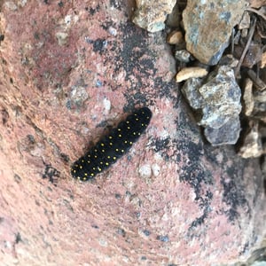 The larva completes five instars before pupating, developing over a period of around 10 to 12 weeks. The first instar larva has a black body with many hairs, and a dull black head. As the larva feeds on its host plant S. lanceolatum, it sequesters in its body sarmentosin from the plant, causing the larva to become distasteful to predators. Conspicuous yellow markings appear on the body after the second instar, warning off predators, as the larva stores higher levels of sarmentosin. The fifth instar larva is black, with many short fine black hairs littered over its body. It sports two lateral and two dorsal rows of bright yellow spots. It has small and pale yellow vestigial osmeteria, a special organ just behind the head that resemble feelers. Since they may not always hatch close to their foodplant, the larvae have a fast, directional search pattern. They tend to feed rapidly on their larval host plant, then move to a basking location on open ground up to a few meters away for thermoregulation. If disturbed, the larvae twitch violently, then drop to the ground to seek cover, and may discharge a bad-smelling brown chemical.