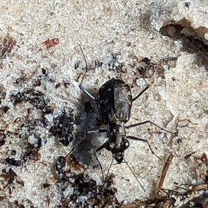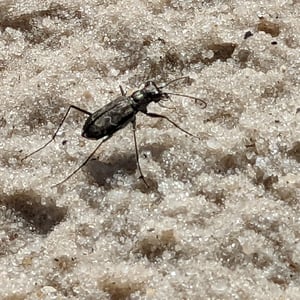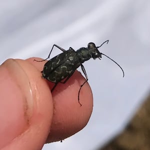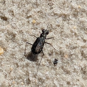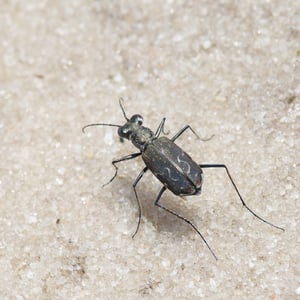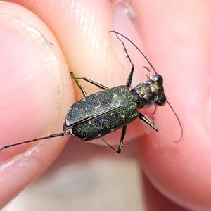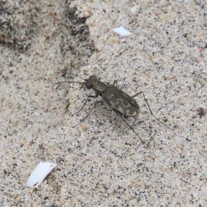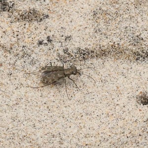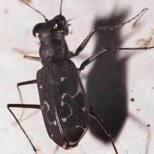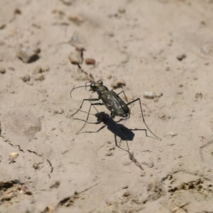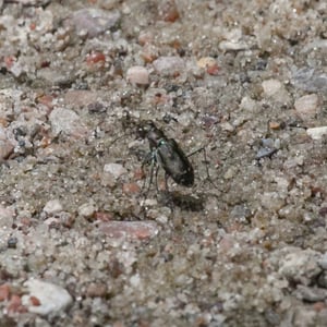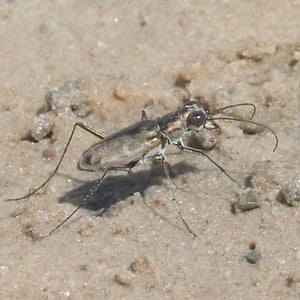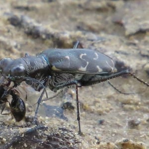 Cicindela trifasciata, commonly known as the three-banded tiger beetle, is a species of ground-dwelling insect belonging to the family Carabidae. It is characterized by its vibrant metallic green or blue coloration and three distinct white bands across its elytra. This predatory beetle is known for its exceptional speed and agility, using its long legs to chase down and capture its prey. Found in various habitats worldwide, the three-banded tiger beetle plays an important role in controlling populations of small insects.