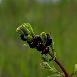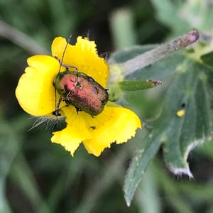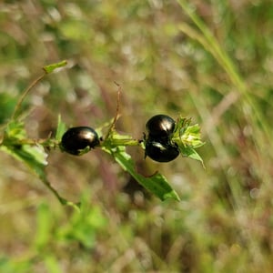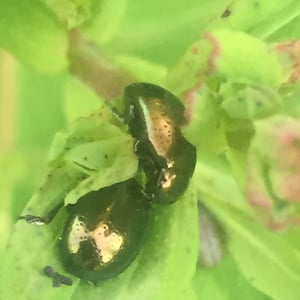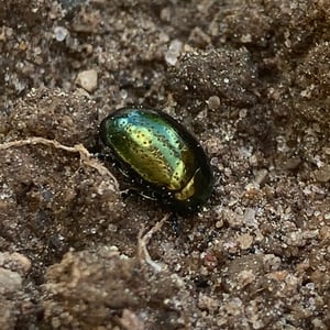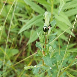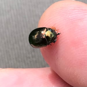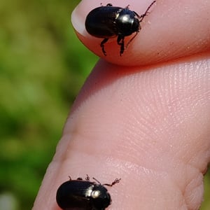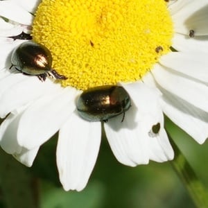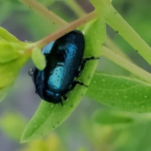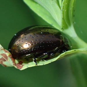 Chrysolina hyperici is a species of leaf beetle commonly known as the St. John's Wort beetle. It is characterized by its vibrant metallic green coloration and its small size, typically measuring around 6-8 millimeters in length. This beetle is native to Europe and is known to feed exclusively on St. John's Wort plants (Hypericum perforatum). It plays an important role in controlling the growth of this invasive plant species.