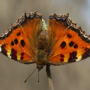 Nymphalis xanthomelas, the scarce tortoiseshell, is a species of nymphalid butterfly found in eastern Europe and Asia. This butterfly is also referred as yellow-legged tortoiseshell or large tortoiseshell (however, in Europe, "large tortoiseshell" is usually reserved for Nymphalis polychloros).
