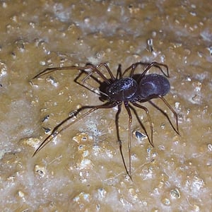 Spitting spiders are typically solitary until mating or hunting due to their aggressive nature. Males are cautious when trying to find a mate. Females carry their eggs until they hatch, typically under their body or in their chelicerae. This is the most vulnerable stage in life, the egg-carrying period. Upon hatching, the juvenile spiders remain in their mother's web. They cooperatively capture and feed on prey caught in the web. Upon reaching sexual maturity, the young spiders leave the web, move a short distance away and exhibit solitary behavior. The genus exhibits sexual dimorphism, males range in size from 3.5 to 4 mm while females are slightly larger ranging from 4 to 4.5 mm. These spiders do not die post-mating; males live 1.5–2 years and females live 2 to 4 years.
