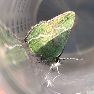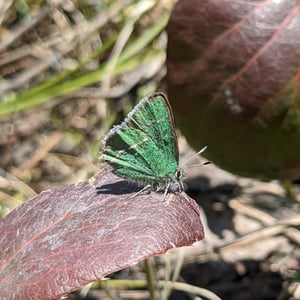 This small, tail-less butterfly has a wingspan of 20 - 24 mm. The upperside is dark gray brown, with underside color ranging from a bright green to dark gray green. The lower part of the forewing is gray. Callophrys sheridanii has a white postmedian line of dots that may be straight or bulged out, and even reduced or absent. It is named for its characteristic straight, white line crossing the underside of both wings, although this may be less distinct in specimens from southern British Columbia.