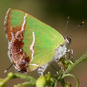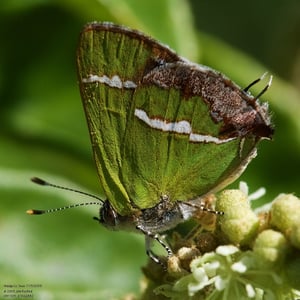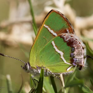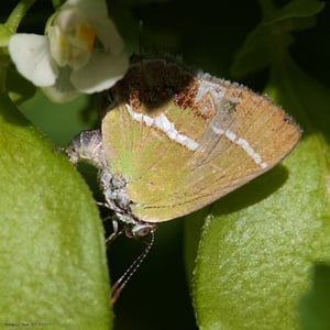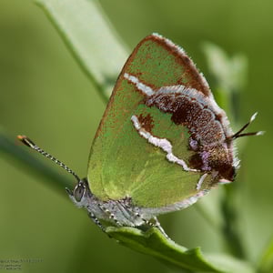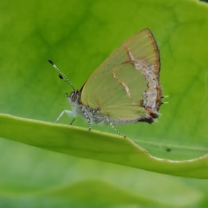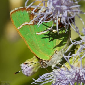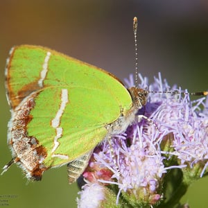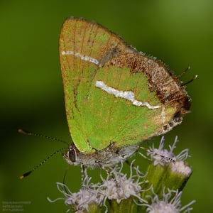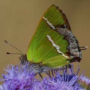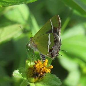 The silver-banded hairstreak is seen from May to December in southern Florida and from June to December in southern Texas. It is seen from March to June and again from October to mid-November in southern Arizona. It will occasionally stray to southern California in October. These butterflies are usually a very pretty light green with a white streak along the top of the wing. Some say this butterfly is a blue to a light brown.