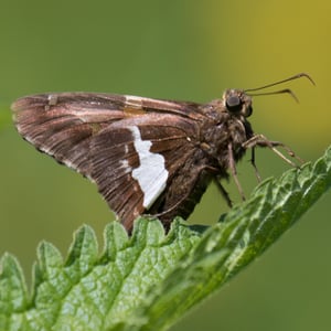 Epargyreus clarus, the silver-spotted skipper, is a butterfly of the family Hesperiidae. It is claimed to be the most recognized skipper in North America. E. clarus occurs in fields, gardens, and at forest edges and ranges from southern Canada throughout most of the United States to northern Mexico, but is absent in the Great Basin and western Texas. E. clarus larvae create and reside in unique shelters stuck together with silk, which do not protect them from predators. Natural predators of the species include paper wasp foragers, sphecid wasp and Crematogaster opuntiae ants. The species is also considered to be a perching species, meaning that adult males compete for territory to attract females. Although E. clarus is considered to be a pest of a few crop plants such as beans, its pest activity is not serious enough to warrant initiating major control measures.