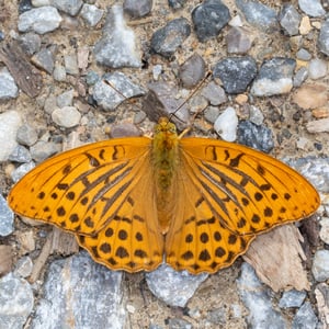 The silver-washed fritillary butterfly is deep orange with black spots on the upperside of its wings, and has a wingspan of 54–70 mm, with the male being smaller and paler than the female. The underside is green, and, unlike other fritillaries, has silver streaks instead of silver spots, hence the name silver-washed. The caterpillar is black brown with two yellow lines along its back and long reddish-brown spines. The male possesses scent scales on the upperside of the forewing that run along veins one to four. The scent produced from these scales attracts females and helps to distinguish it from other species.