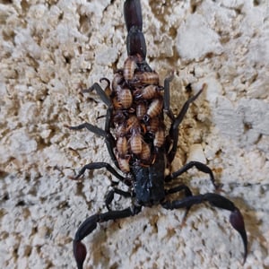 The female gives birth to a litter of 25 to 35 young, with litters of 91 recorded. The juveniles ride on the female's back and undergo their first molt at eight days of age. A study of captive scorpions revealed the length of their life cycle. The juveniles progress through instar stages, sometimes dying of complications with the molting process. The female reaches maturity in roughly 300 days, after seven instars, but the males mature at different rates. Some reach sexual maturity in the sixth instar, at about 235 days of age, while some are not mature until the seventh instar, around 281 days old. At mating, the male engages in courtship behavior and produces a spermatophore. Females can reproduce via parthenogenesis, as well. In the laboratory the males had an average life span of about 33 months, while the females lived about 38 months.