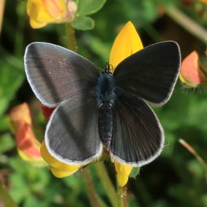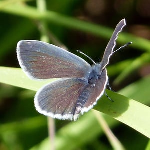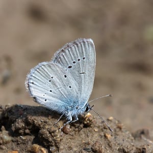 Small blue males are dark brown with a scattering of bright blue scales that speckle their wings. Females lack this blue speckling. Both males and females exhibit the characteristic silver underside with black spots. The male has a bluish tint at the base of its wings similar to the upper side. Their wingspan can fall anywhere from 16-27mm, but males tend to be the smaller sex. Small blues are often confused with the female Osiris Blue, whose coloring is similar to that of the male small blue.