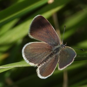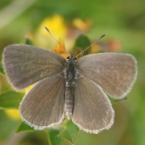 The small blue (Cupido minimus) is a Palearctic butterfly in the family Lycaenidae. Despite its common name, it is not particularly blue. The male has some bluish suffusion at the base of its upper wings but is mostly dark brown like the female. The species can live in colonies of up to several hundred and in its caterpillar stage is cannibalistic.