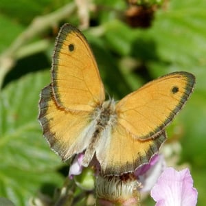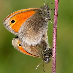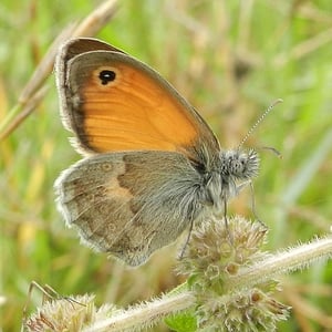 The small heath (Coenonympha pamphilus) is a butterfly species belonging to the family Nymphalidae, classified within the subfamily Satyrinae (commonly known as "the browns"). It is the smallest butterfly in this subfamily. The small heath is diurnal and flies with a noticeable fluttering flight pattern near the ground. It rests with closed wings when not in flight. It is widespread in colonies throughout the grasslands of Eurasia and north-western Africa, preferring drier habitats than other Coenonympha, such as salt marshes, alpine meadows, wetlands, and grasslands near water (i.e. streams). However, habitat loss caused by human activities has led to a decline in populations in some locations. The larval host plants are grasses, found in various habitats, while adult butterflies feed on nectar from flowers. The males of this species are territorial, which plays a large role in obtaining a female mate. To establish dominance, they partake in lekking, a mating display in which males aggregate in a competitive display to attract passing females.