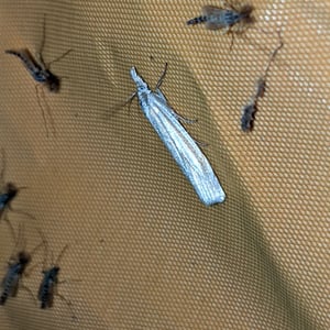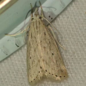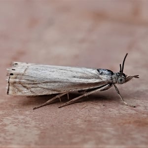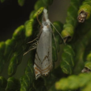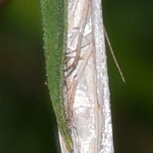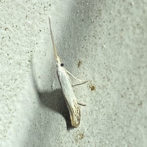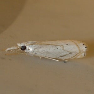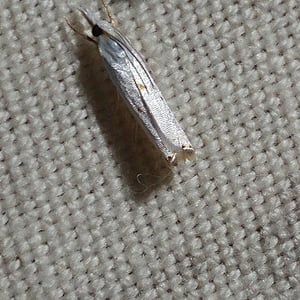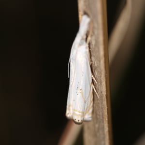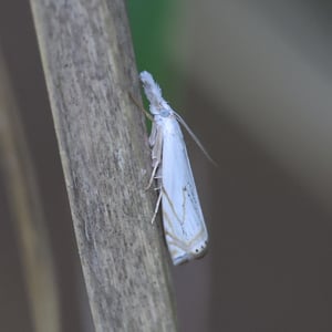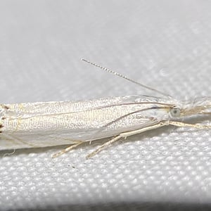 Crambus albellus is a small moth belonging to the family Crambidae. It has a wingspan of about 15-20 mm and is predominantly white in color, with faint brownish markings. This species is commonly found in grassy habitats, such as meadows and marshes, where its larvae feed on various grasses. Crambus albellus is known for its delicate appearance and graceful flight patterns.