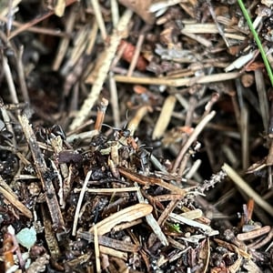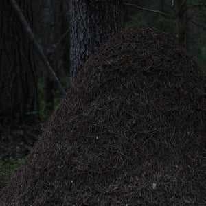 Nests of these ants are large, conspicuous, dome-shaped mounds of grass, twigs, or conifer needles, often built against a rotting stump, usually situated in woodland clearings where the sun's rays can reach them. Large colonies may have 100,000 to 400,000 workers and 100 queens. F. rufa is highly polygynous and often readopts postnuptial queens from its own mother colony, leading to old, multigallery nests that may contain well over 100 egg-producing females. These colonies often may measure several metres in height and diameter. F. rufa is aggressively territorial, and often attacks and removes other ant species from the area. Nuptial flights take place during the springtime and are often marked by savage battles between neighbouring colonies as territorial boundaries are re-established. New nests are established by budding from existing nests in the spring, or by the mechanism of temporary social parasitism, the hosts being species of the F. fusca group, notably F. fusca and F. lemani, although incipient F. rufa colonies have also been recorded from nests of F. glebaria, F. cunnicularia, and similar species including the genus Lasius. An F. rufa queen ousts the nest's existing queen, lays eggs, and the existing workers care for her offspring until the nest is taken over.