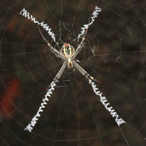 Its web possesses meandering, bluish-white ribbons consisting of silk that can form either a full or partial cross through the center of the web. The purpose of the crucifix-like stabilimentum has long perplexed biologists, who first thought that the stabilimentum's purpose is to strengthen the web. Other ideas associate it with capturing prey or evading its predators, though the purpose of its stabilimentum remains a mystery. One feature of the stabilimentum is that it effectively reflects ultraviolet light, making it attractive to flying insects. Biologists think this may be to increase the chance of catching its prey. The design of the stabilimentum makes the web and the spider obvious to diurnal predators, especially birds and wasps.The shape of this decoration can vary from three shapes, a complete cross, a partial cross possessing one to three arms, or occasionally an absence of a decoration. This variability can induce web-recognition problems for predators. Biologists also found a possibility that the stabilimentum may be a warning to predators to stay away.