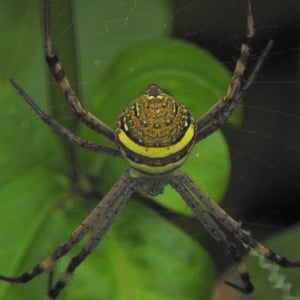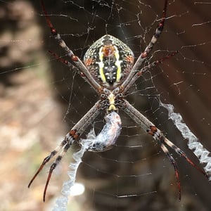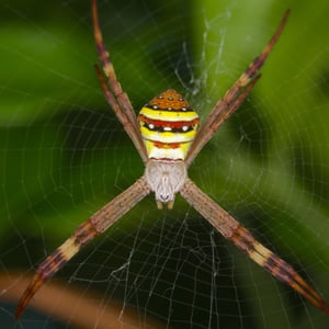 Argiope keyserlingi is a species of orb-web spider found on the east coast of Australia, from Victoria to northern Queensland. It is very similar in appearance to a closely related north Queensland species, Argiope aetherea. A. keyserlingi is commonly found in large populations in suburban parks and gardens, particularly among the leaves of Lomandra longifolia. Like many species of orb-web spider, A. keyserlingi shows considerable sexual dimorphism, as the females are many times larger than the males. Mature females can be seen during the summer, and seeing multiple males on the web of one female is not uncommon. A. keyserlingi is commonly known as the St. Andrew's cross spider, due to the construction of bands of silk forming the arms of an X-shaped cross, similar to the one upon which St. Andrew is traditionally said to have been crucified. Juveniles of this species sometimes build a spiral-shaped pattern of silk. Referred to as web decorations or stabilimenta, these bands are thought to increase the species' prey capture rate, but as in other species, they have been found to protect the spider against predators. A. keyserlingi is an important model species in studies of spider ecology and behaviour. Using this species, scientists have investigated sperm competition, sexual size dimorphism, cryptic female choice, the role of pheromones in mating behaviour, and the function and evolution of web decorations. Its main predators in Sydney are mantids and birds. This type of orb-weaver is cathemeral.