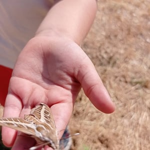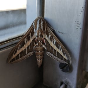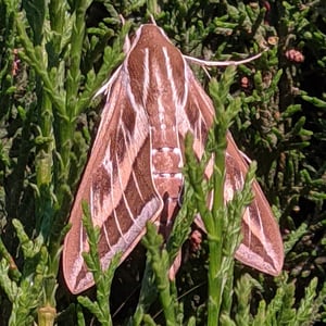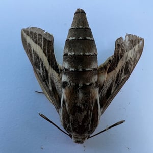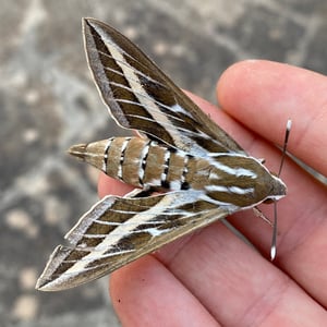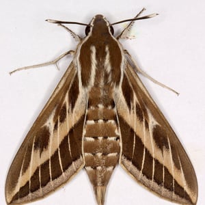 Hyles livornica has a wingspan reaching 60–80 mm. Males are slightly smaller than females. The forewings and the body are mainly olive brown or beige, with white stripes. The hindwings are pink, with black and white edges. The head and the thorax are olive-brown, with white stripes. The olive-brown abdomen has black-and-white segment, the first two segments have large black and white side spots. The antennae are dark olive brown and have a white tip. These moths fly from February to October depending on the location. In Europe they are visible from April to June and from August to September in two generations and sometimes they overwinter. This species is a migrant from Africa to Europe. The caterpillars are green, with black markings and reach a length from 65 to 80 millimeters.