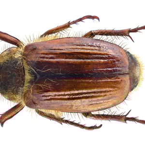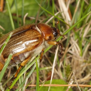 Amphimallon solstitiale, also known as the summer chafer or European june beetle, is a beetle similar to the cockchafer but much smaller, approximately 20 millimetres (0.79 in) in length. They are declining in numbers now, but where found they are often seen in large numbers. At dusk they actively fly around tree tops looking for a mate and can often be found drowning in pools of water the following morning. They are also attracted to light and come in through open, lit windows and fly around lamps, making quite a racket while bumping into lights. They are found throughout the Palearctic region, commonly seen from June to August, living in meadows, hedgerows, and gardens, and eating plants and tree foliage.