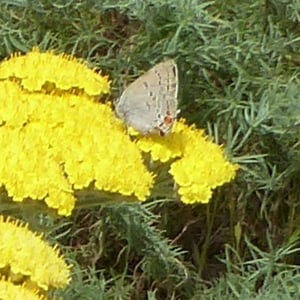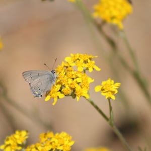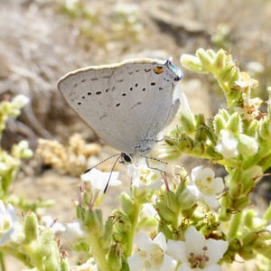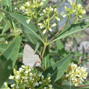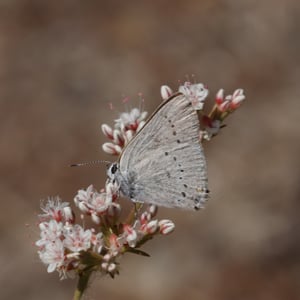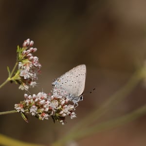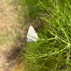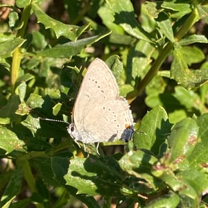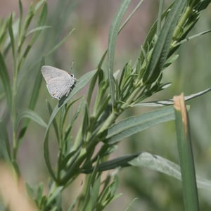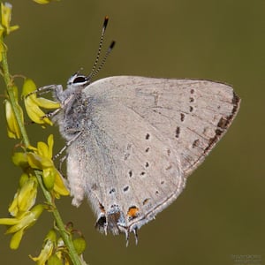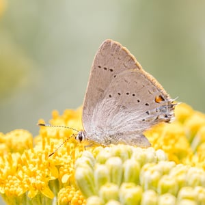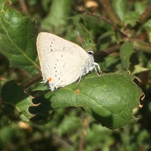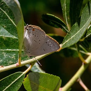 Satyrium sylvinus, commonly known as the Woodland Hairstreak, is a small butterfly species belonging to the family Lycaenidae. It is typically found in woodland habitats across North America. The wingspan of Satyrium sylvinus ranges from 1 to 1.5 inches, and its wings are predominantly brown with intricate patterns of orange and white spots. This species is known for its elusive behavior, often seen perching on leaves or flowers with its wings closed, blending in with its surroundings.