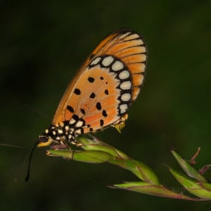 Acraea terpsicore, the tawny coster, is a small, 53-64 mm, leathery-winged butterfly common in grassland and scrub habitats. It belongs to the Nymphalidae or brush-footed butterfly family. It has a weak fluttery flight. It is avoided by most insect predators. This species and the yellow coster (Acraea issoria) are the only two Indian representatives of the predominantly African tribe Acraeini. It is found in India, Sri Lanka, Maldives to Myanmar, Thailand, Laos, Cambodia, Vietnam, Bangladesh, Singapore, and recently Australia