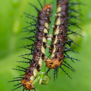 The fully grown caterpillar is about 21 mm in length. It is reddish brown on the upperside and a yellowish white on the underside. Each body segment bears a number of branched spines. The head is reddish. The caterpillars of a batch tend to feed gregariously and devour all soft tissue of the host plant. In this manner they can become a major menace to the passion flower plant they are feeding on. Like the adults, the caterpillar is protected by the toxins, processed from the Passiflora species. "Cylindrical, slender, with six longitudinal rows of fine branched spines; colour reddish brown with an oily gloss, much paler on the head, second and last segment; an unwholesome looking insect, doubtless protected like the butterfly." (Davidson & Aitken)