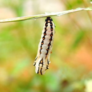 The pupa boldly marked with aposematic colours, advertising the fact that this is an unwholesome object if eaten. It is white with thick black lines, spots and markings in red and orange. The pupa hangs freely from the support without the aid of a band. The pupa is 17 mm long. "Perpendicularly hung, long, slender, smooth; two lateral angles on the thorax; head quadrate; colour creamy white, with broad longitudinal bars of purplish-black spotted with orange." (Davidson & Aitken.)