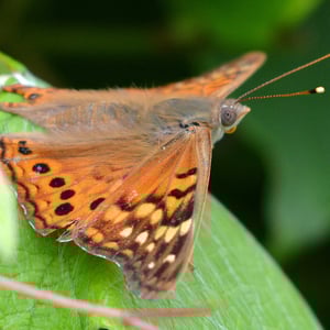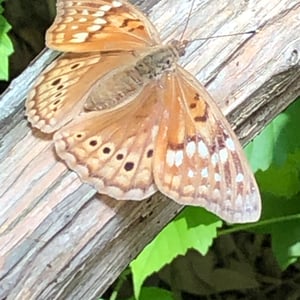 Asterocampa clyton, the tawny emperor, is a species of brush-footed butterfly. It is native to North America, especially the eastern half from Canada to northern Mexico. The tawny emperor should not be mistaken for a very similar Asterocampa butterfly, the hackberry emperor, which can be distinguished by the white spots near the front of its wings. The upperside is mostly dark brown. The forewing is an orange-brown color with pale orange-yellow spots. The underside is mainly gray brown with the forewing having some black and pale yellowish markings. The wingspan measures 2 to 2.6 inches (51 to 66 mm). This butterfly may be seen flying near houses, gravel driveways, near water, muddy places, gardens, and woodlands. Its only host plant is hackberry trees. The adult feeds on carrion, plant sap, and dung, and rarely land on flowers. The female lays clusters of green eggs. The larva is green with yellow, white, or greenish stripes.