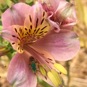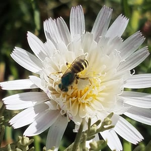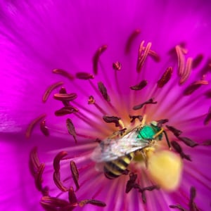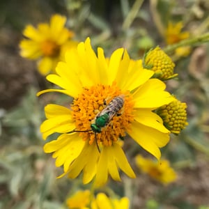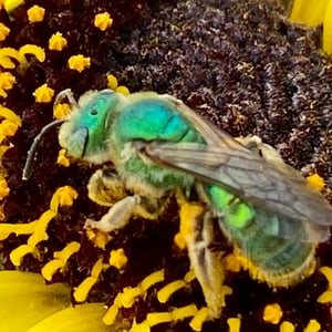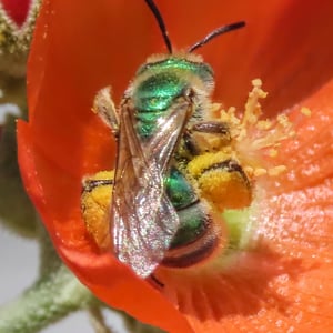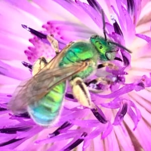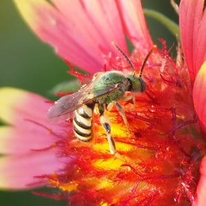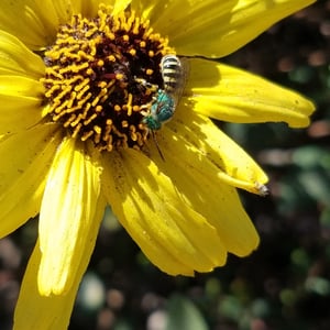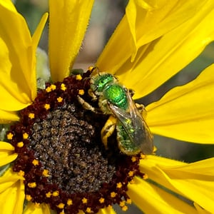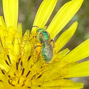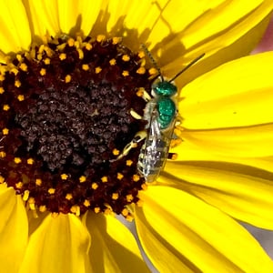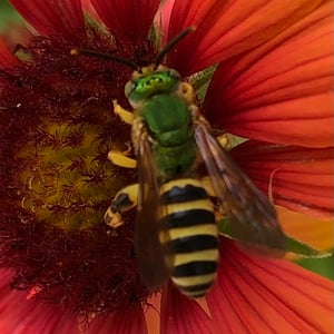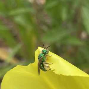 Agapostemon texanus, commonly known as the Texas sweat bee, is a species of solitary bee found in the southern United States. These bees are known for their vibrant metallic green coloration, which distinguishes them from other species. They are important pollinators, visiting a variety of flowers to collect nectar and pollen. Agapostemon texanus nests in the ground, creating small burrows where they lay their eggs and provide provisions for their offspring.